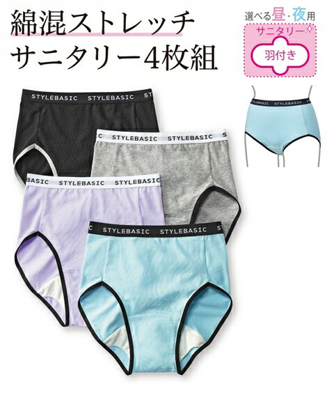 ショーツ サニタリー レディース 綿混 ストレッチ カジュアルレギュラーサニタリー 夜用 4枚組 羽付ナプキン対応 4L/5L/6L ニッセン