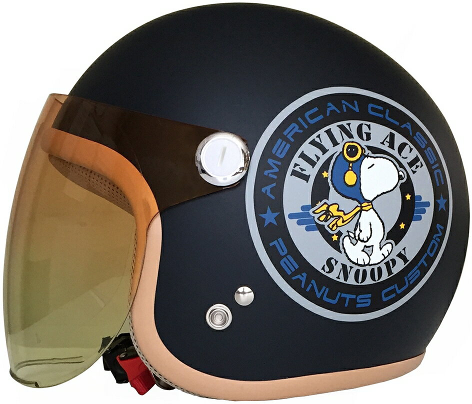 パイロットキャップにゴーグルを合わせ、スカーフを纏うスヌーピーにアメリカンバイクが描かれていて、それぞれの帽体カラーにあわせた独自の配色になっています。